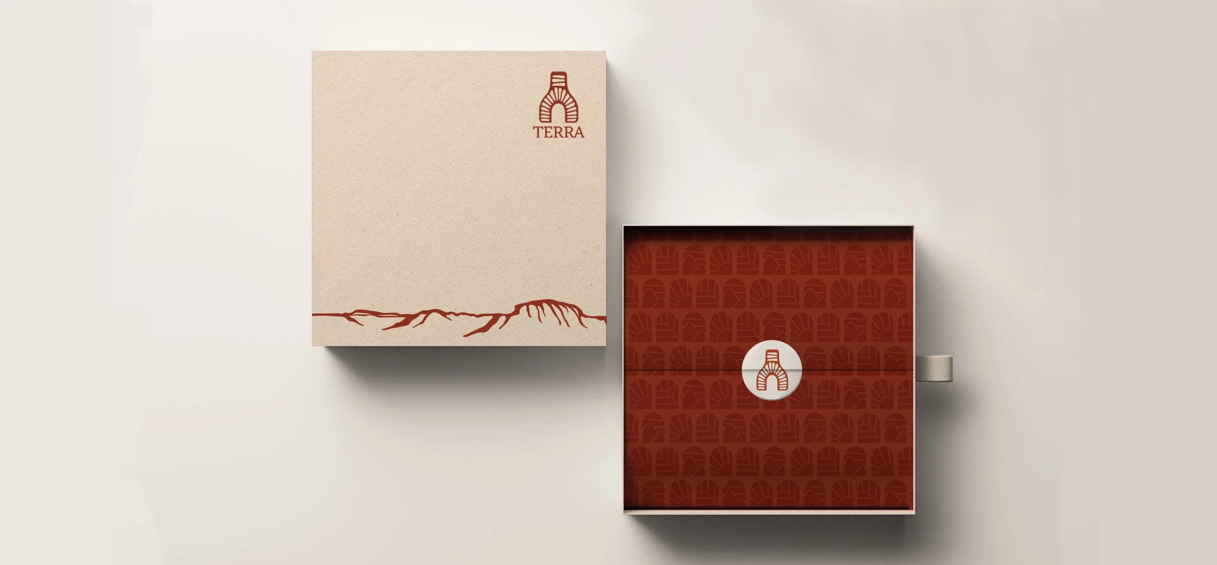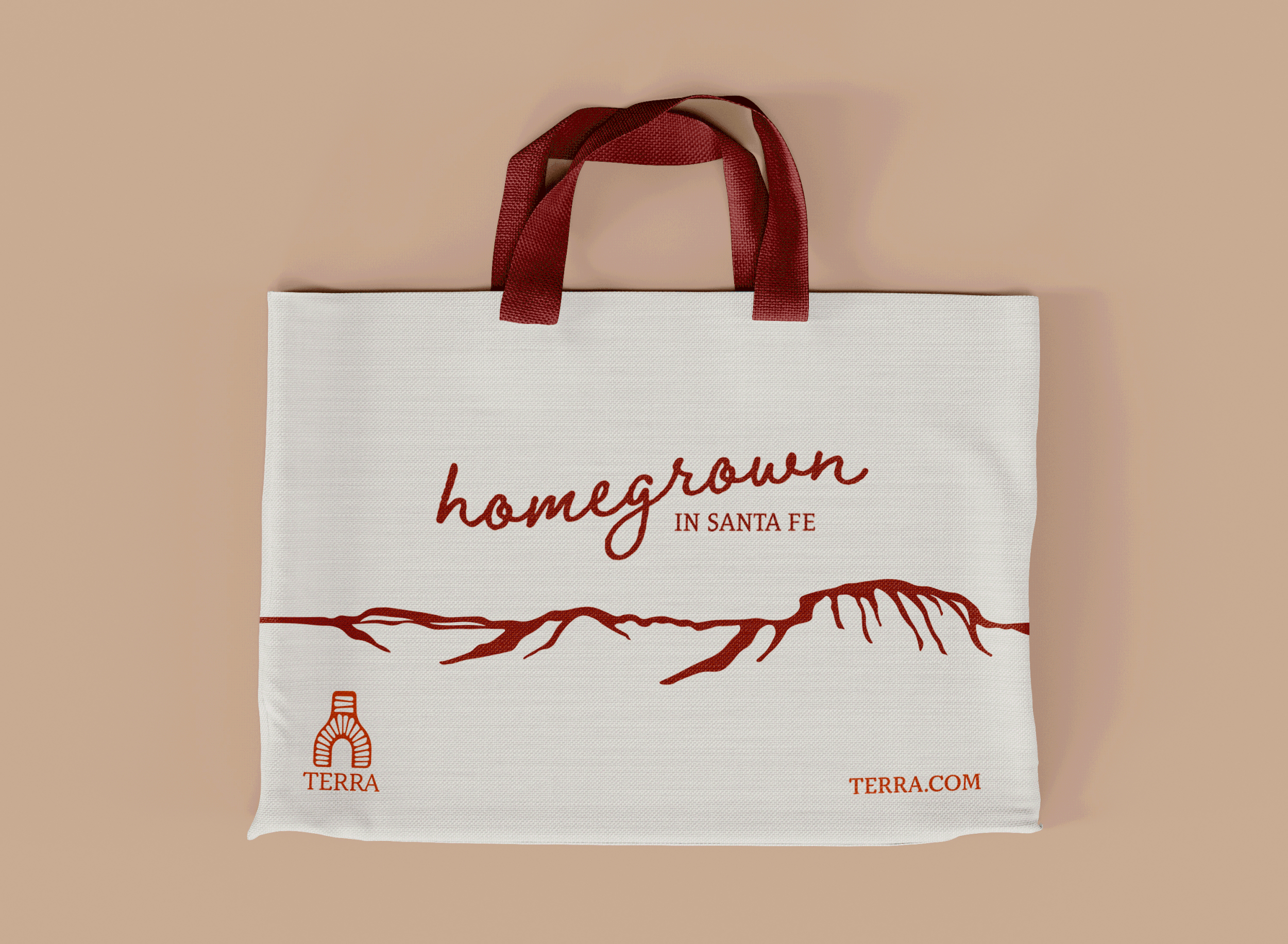 The brand’s name is Terra, derived from the word “terracotta”, which is commonly used in New Mexico architecture. The name then informed the logo, which pulls from the shape of the iconic New Mexico fireplace (or hearth). Using the fireplace as the icon provides viewers with a visual reference back to the brand’s function and roots. Terra’s collateral communicates the warm and welcoming personality that references the brand’s foundation in New Mexico.